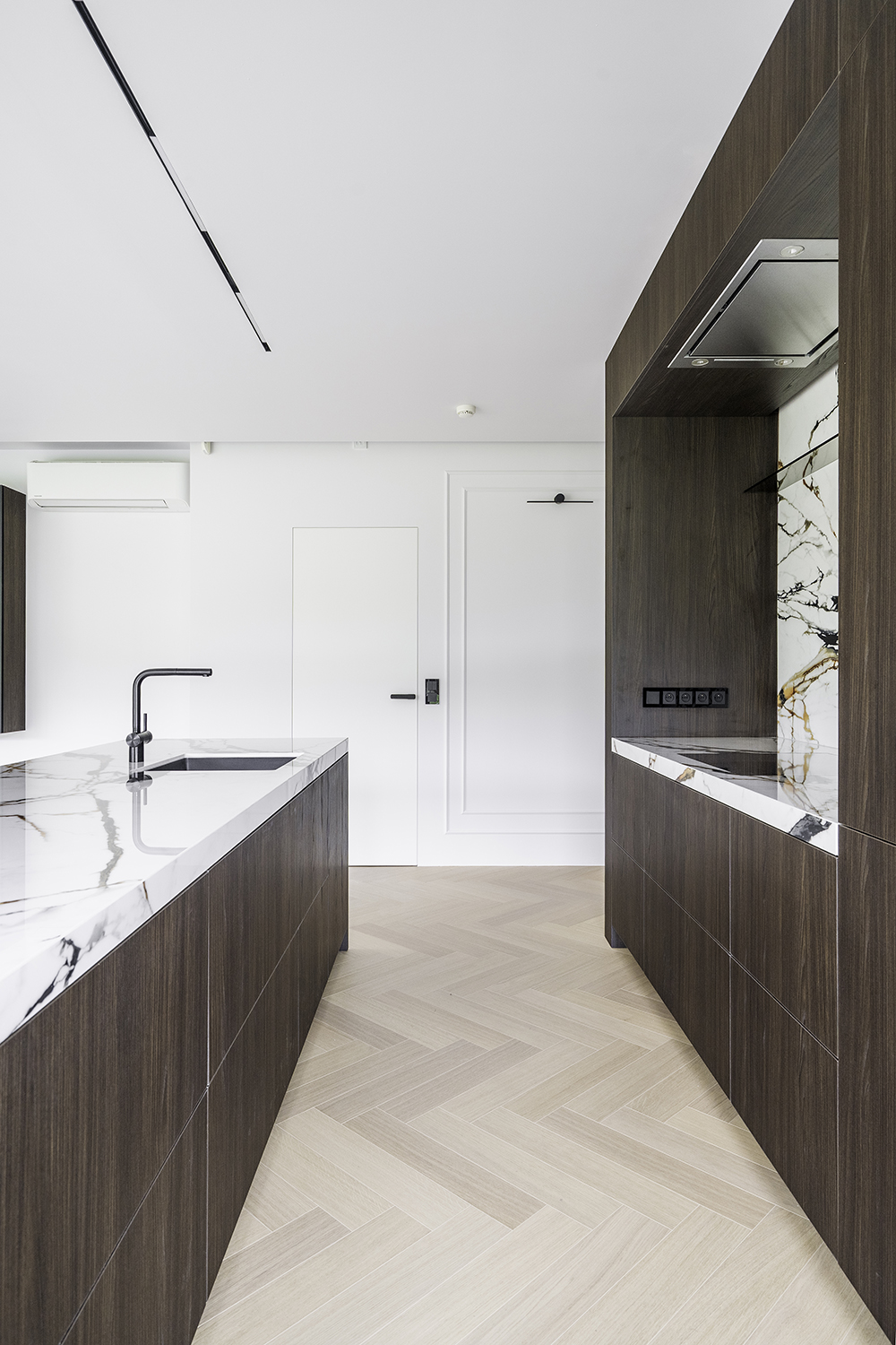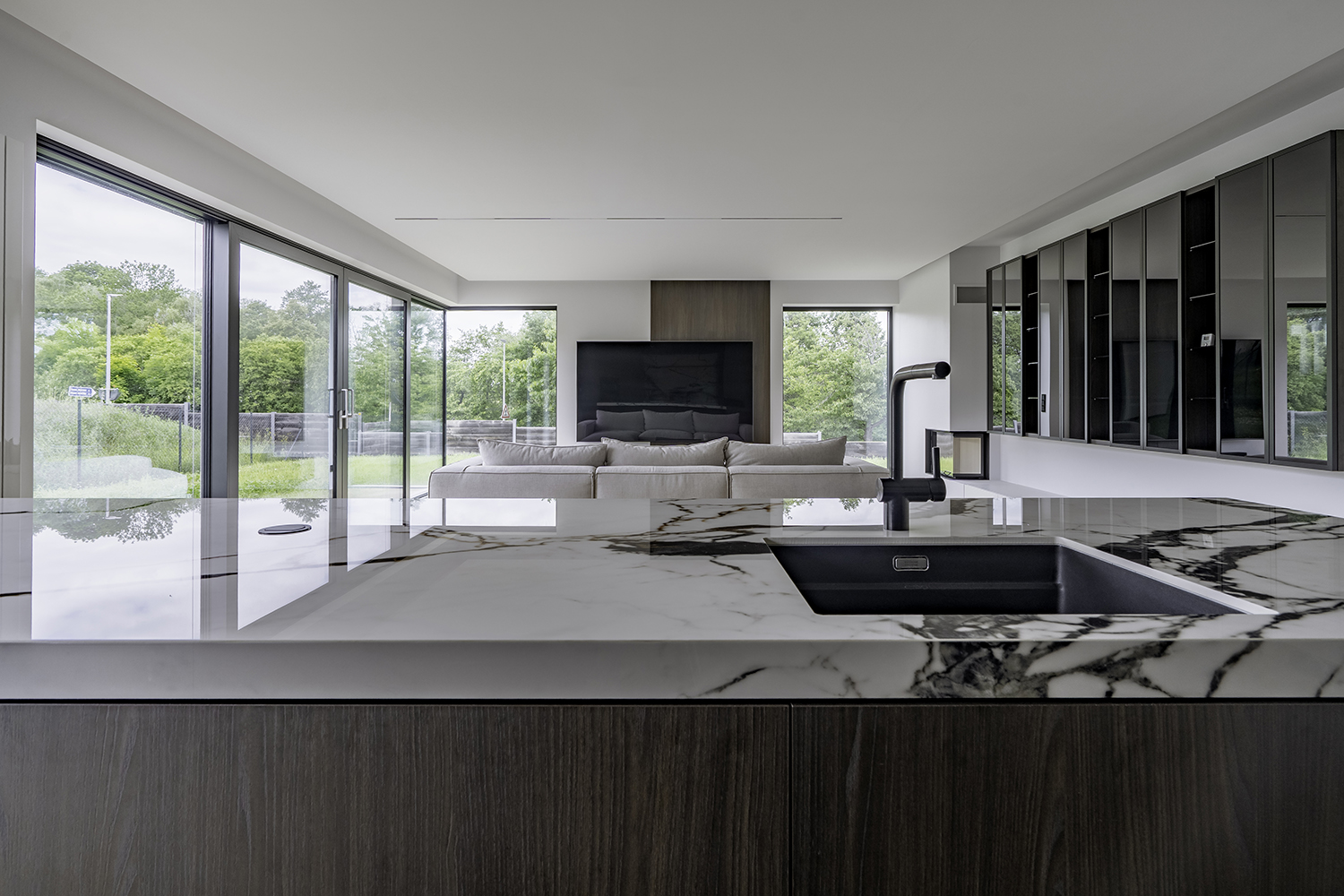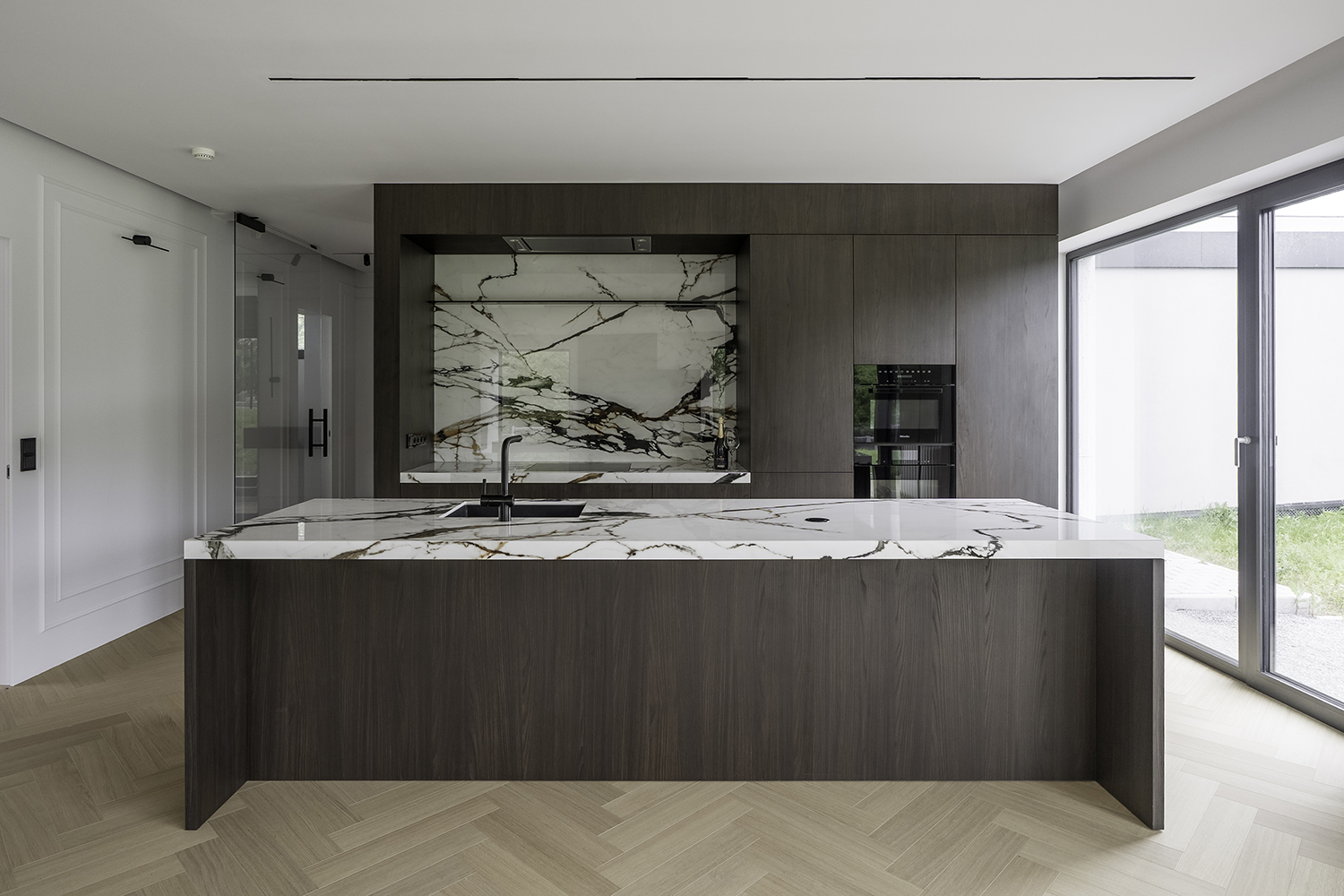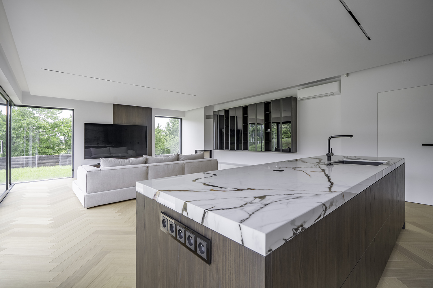 Kuchyně a obývací pokoj: obklad kuchyně a pracovní deska Porcelanosa – Paonazzo Biondo, atypický nábytek, dveře se skrytou zárubní Durus, dýhovaná podlaha Swing Ivory Oak