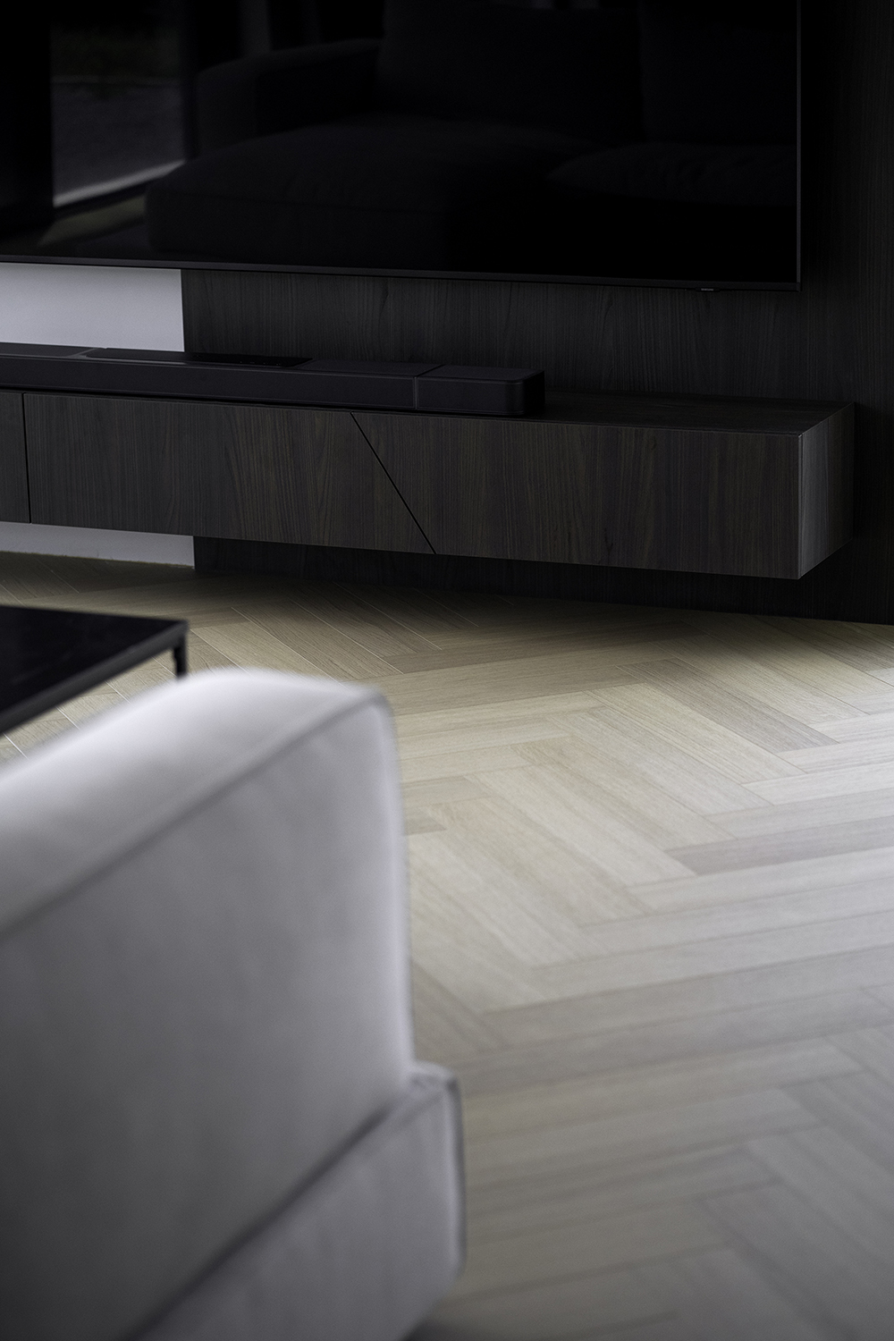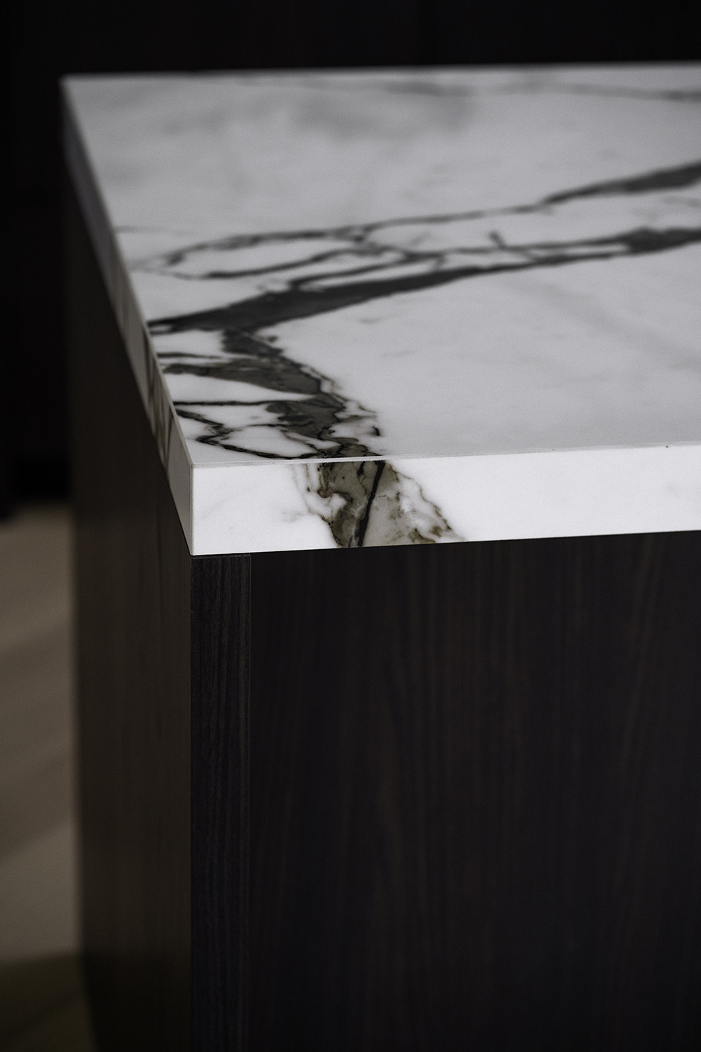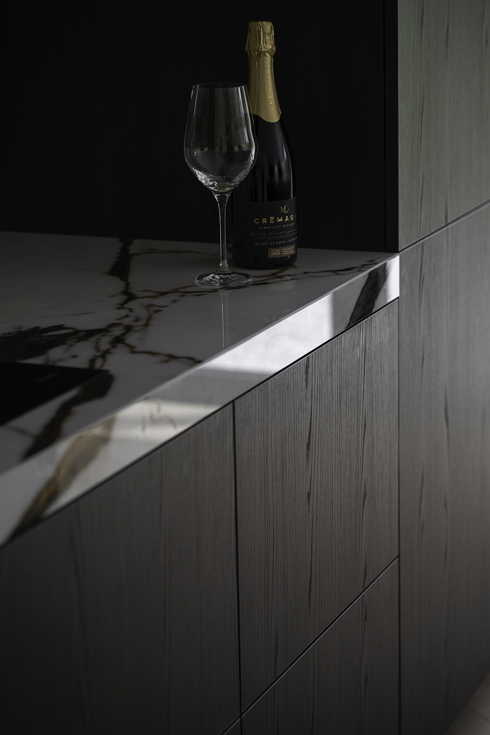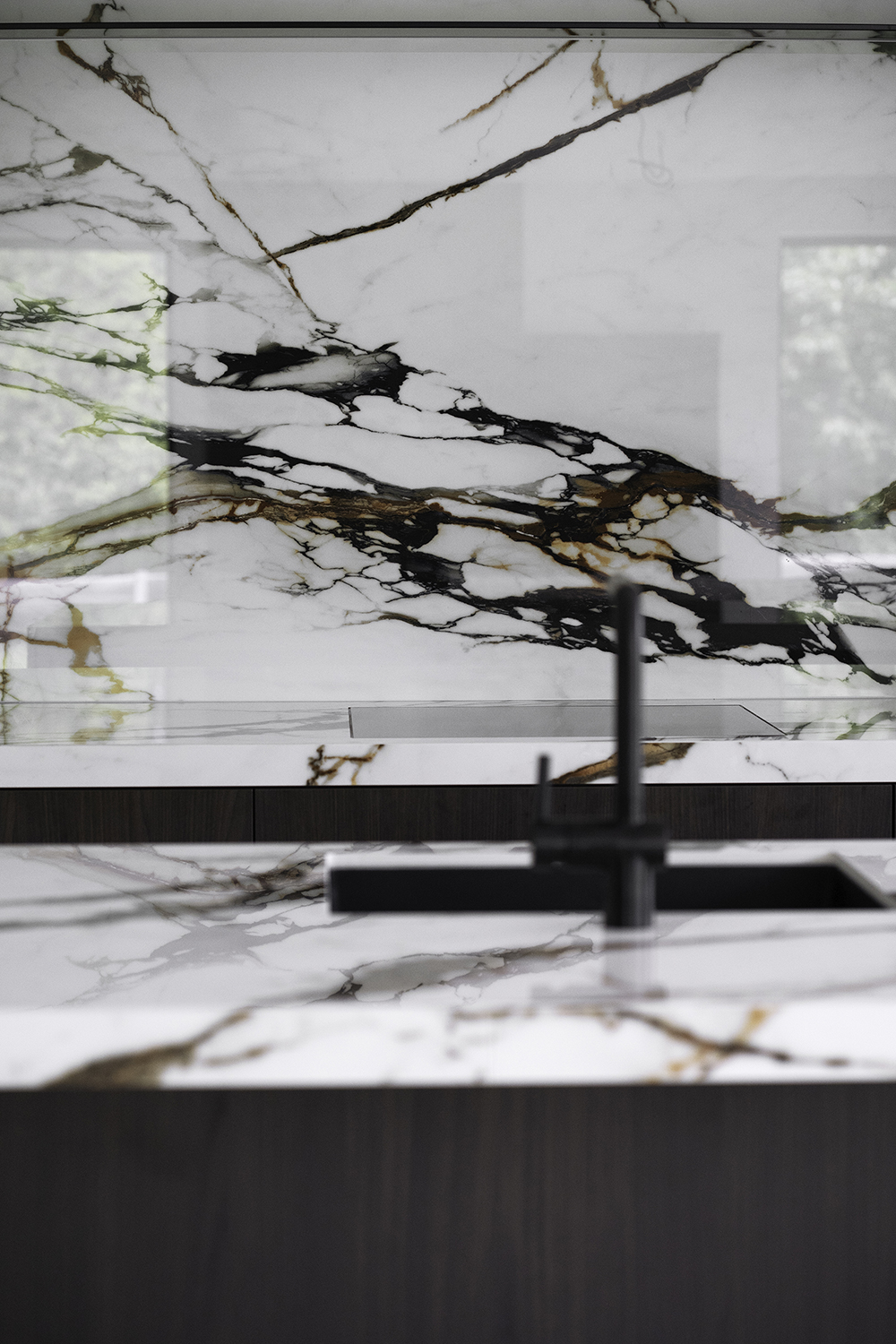 Kuchyně a obývací pokoj: obklad kuchyně a pracovní deska Porcelanosa – Paonazzo Biondo, atypický nábytek, dveře se skrytou zárubní Durus, dýhovaná podlaha Swing Ivory Oak