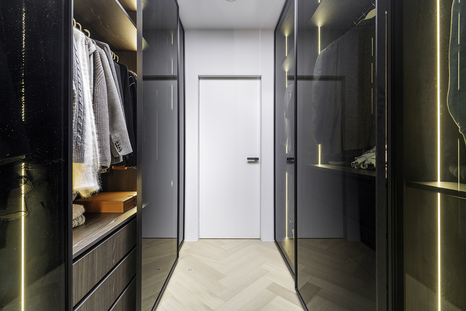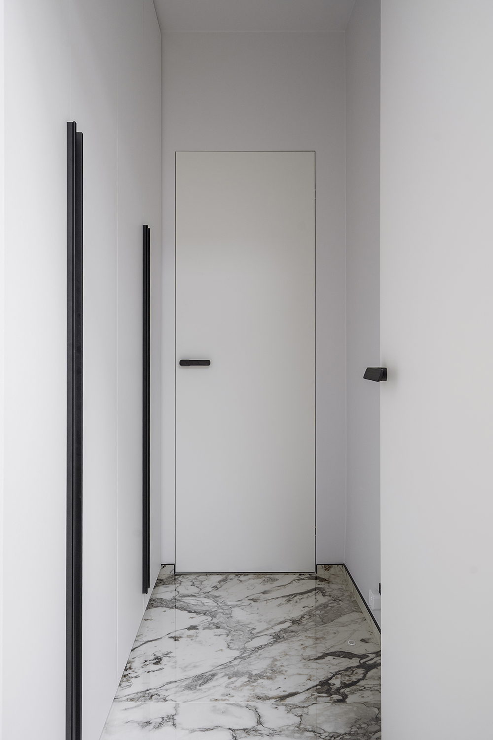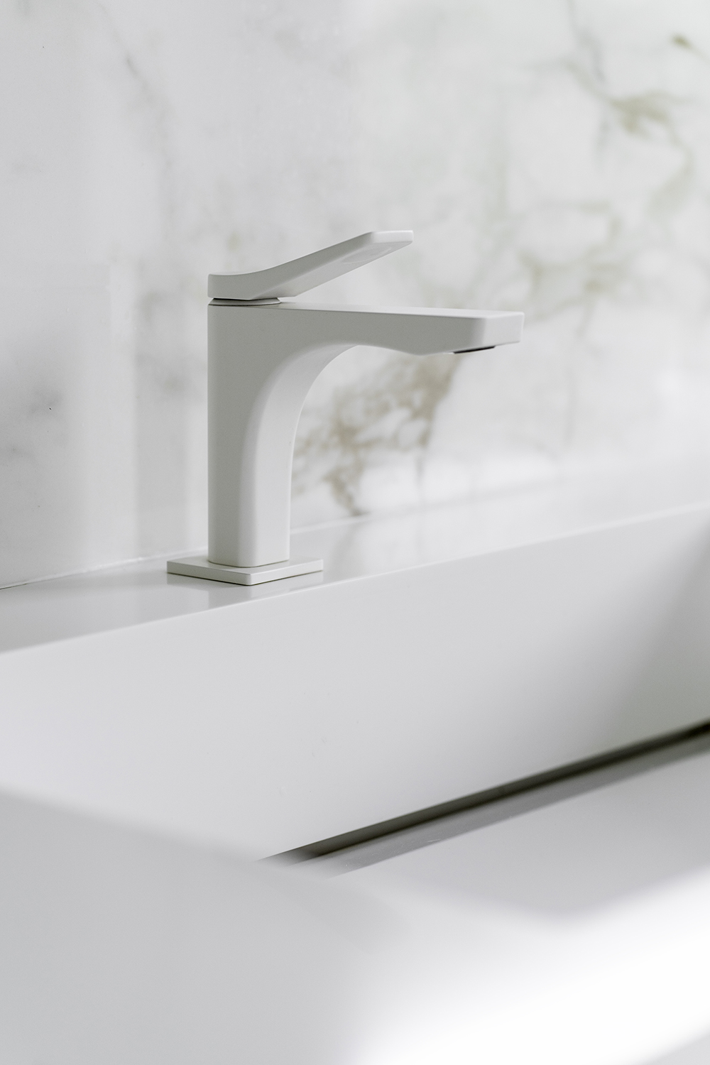 Toaleta pro hosty: umyvadlo a WC Catalano – Verso, baterie a hygienická sprška Gessi – Rettangolo K, velkoformátový obklad stěn Porcelanosa – Moon White, velkoformátová dlažba Marazzi – Capraia Lux Ret