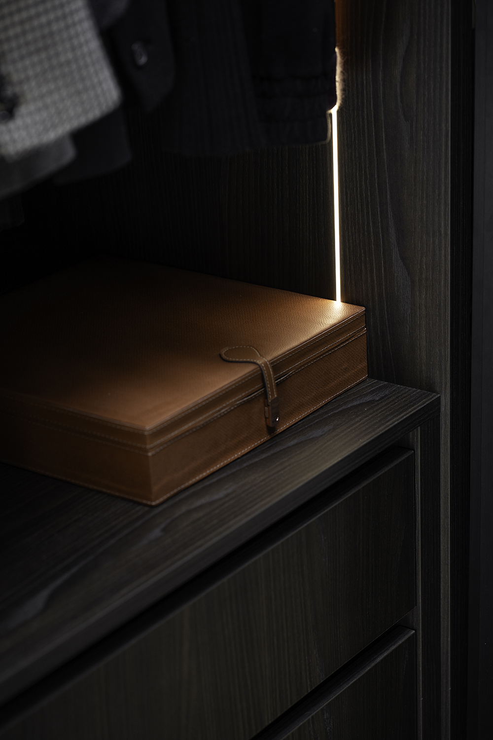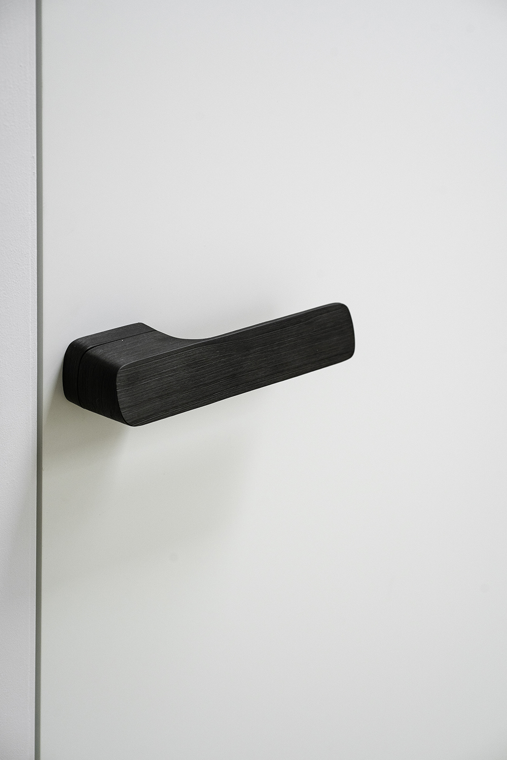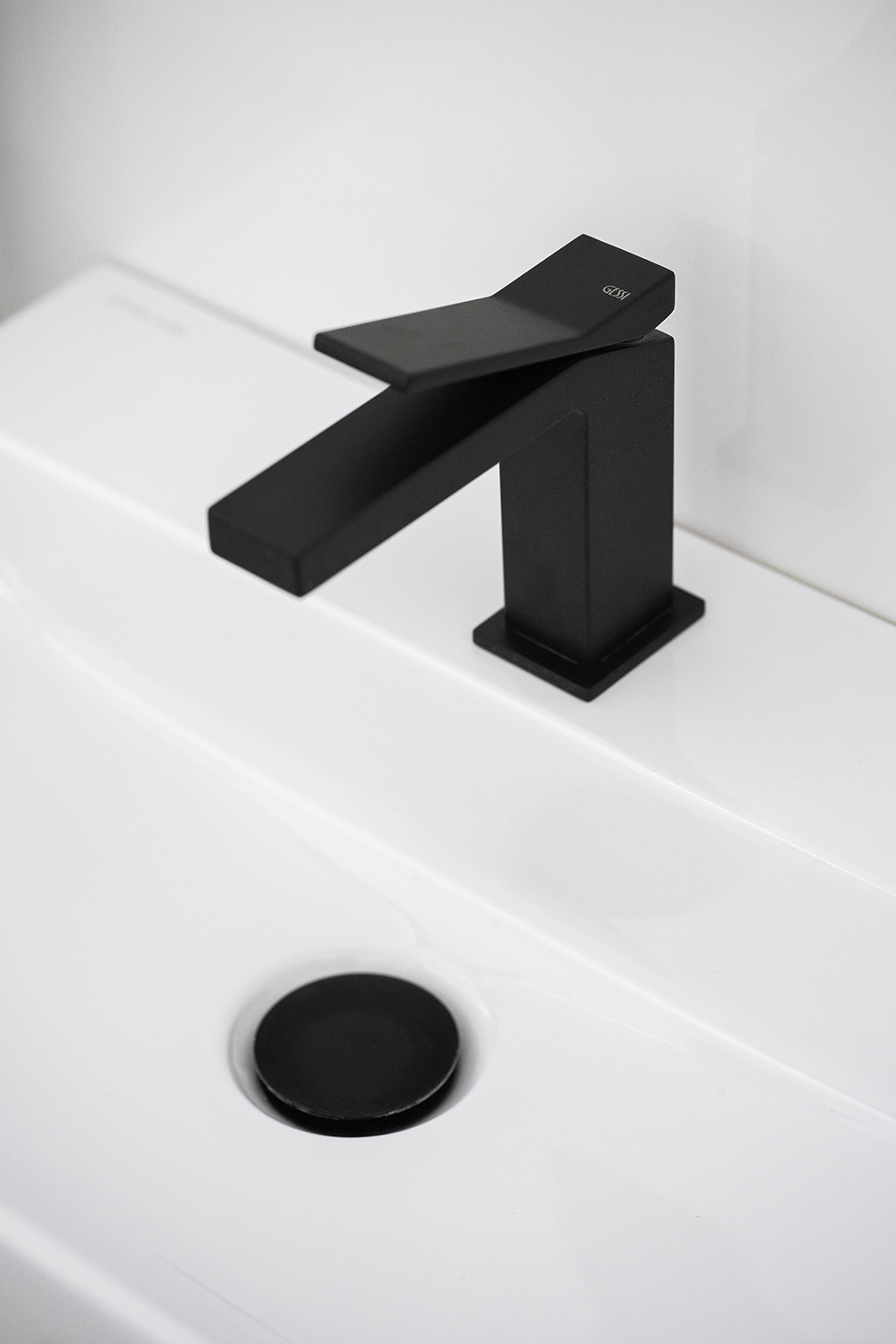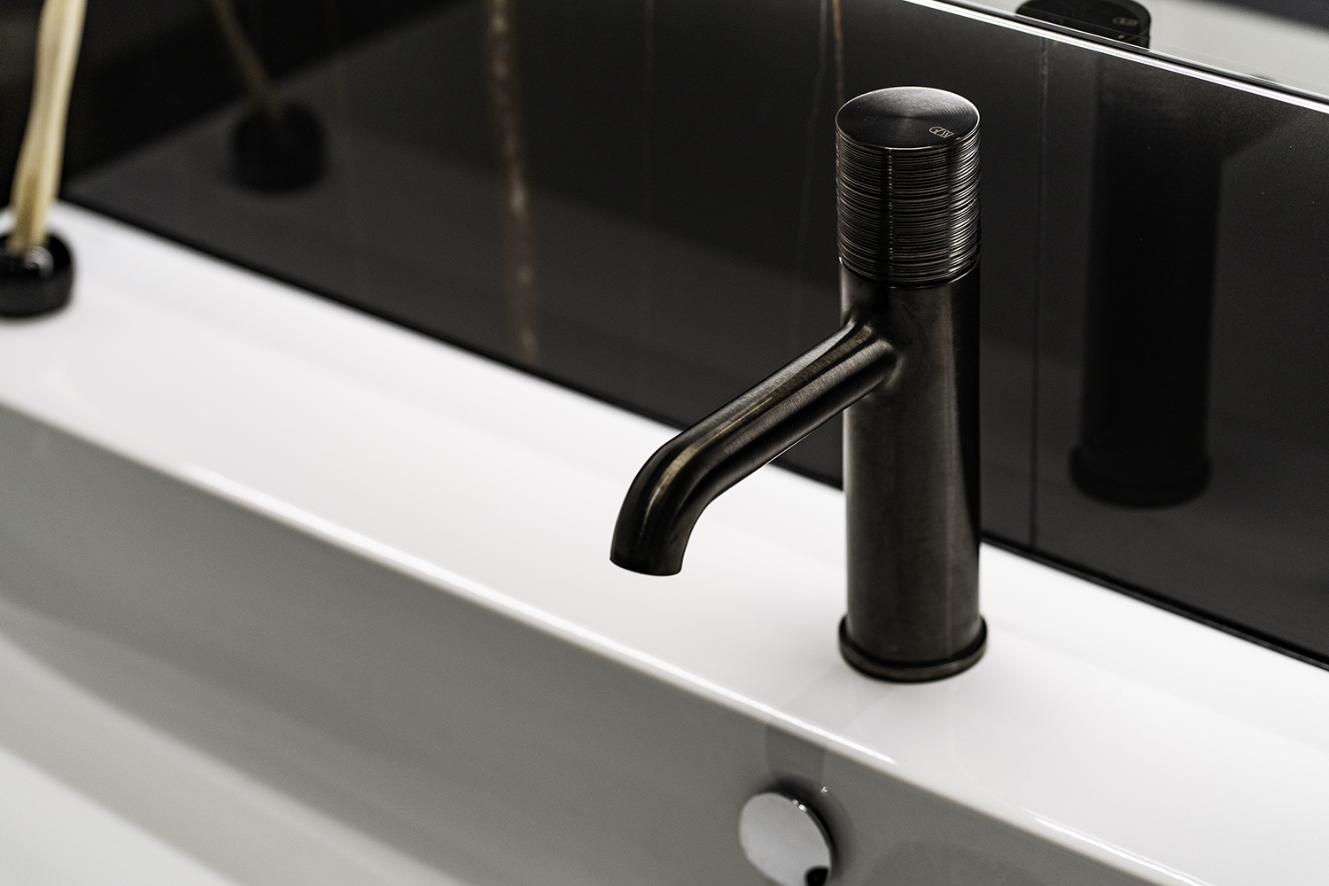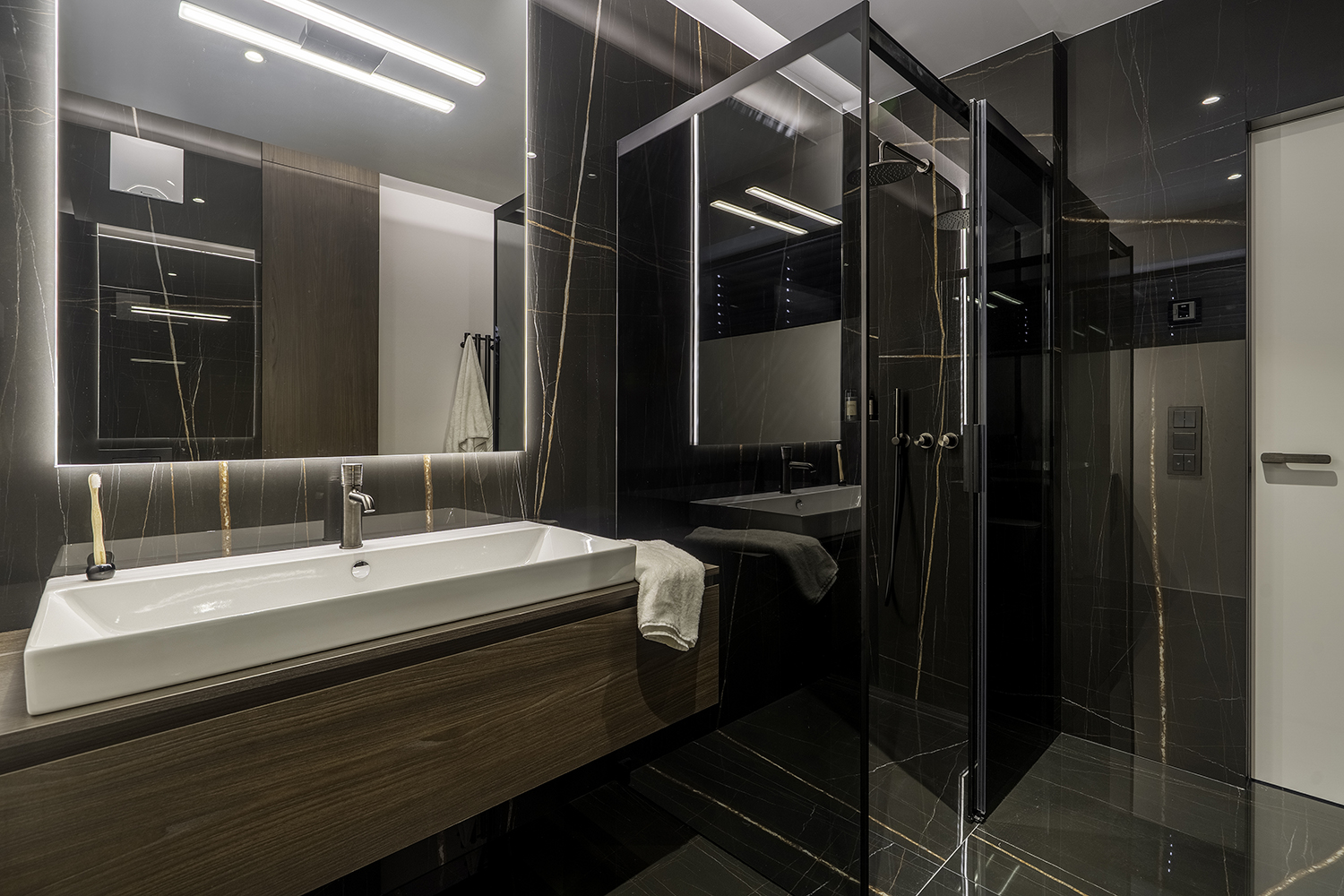 Tmavá koupelna: umyvadlo a WC Catalano – Zero a Verso, umyvadlová baterie, hygienická sprška a sprchový set Gessi – Habito Trame, sprchové posuvné dveře Duka, velkoformátový obklad a dlažba Porcelanosa – Nylo Noir
