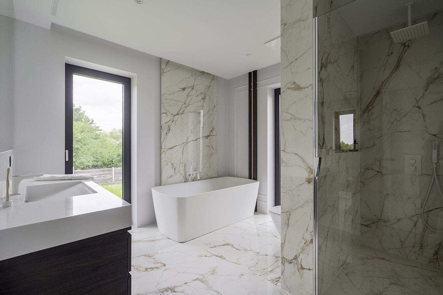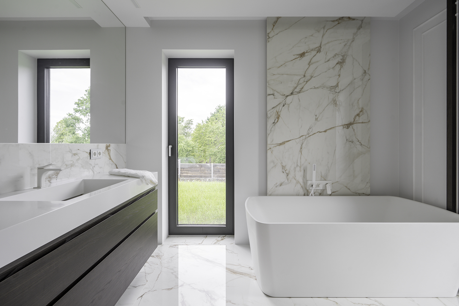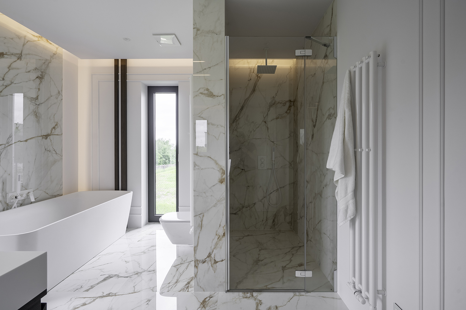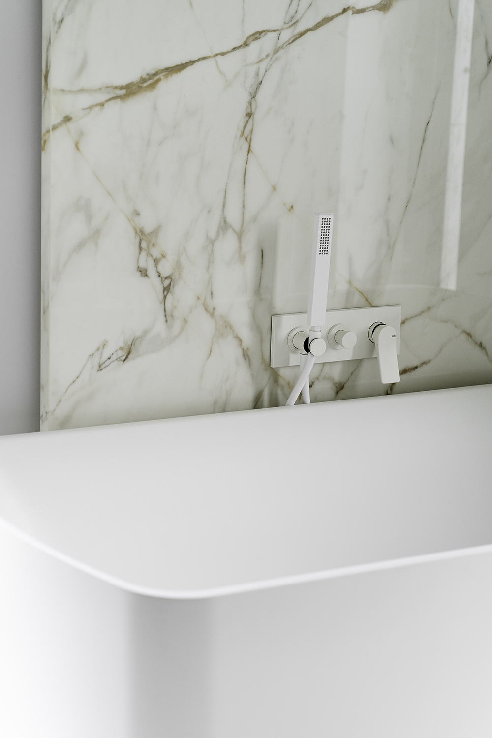 Světlá koupelna: umyvadlo a WC Catalano – Zero a Verso, umyvadlová i vanová baterie, hygienická sprška a sprchový set Gessi – Rilievo, vana s napouštěním přepadem Knief – Cube, sprchové křídlové dveře Duka, velkoformátový obklad a dlažba Porcelanosa – Calacatta Gold