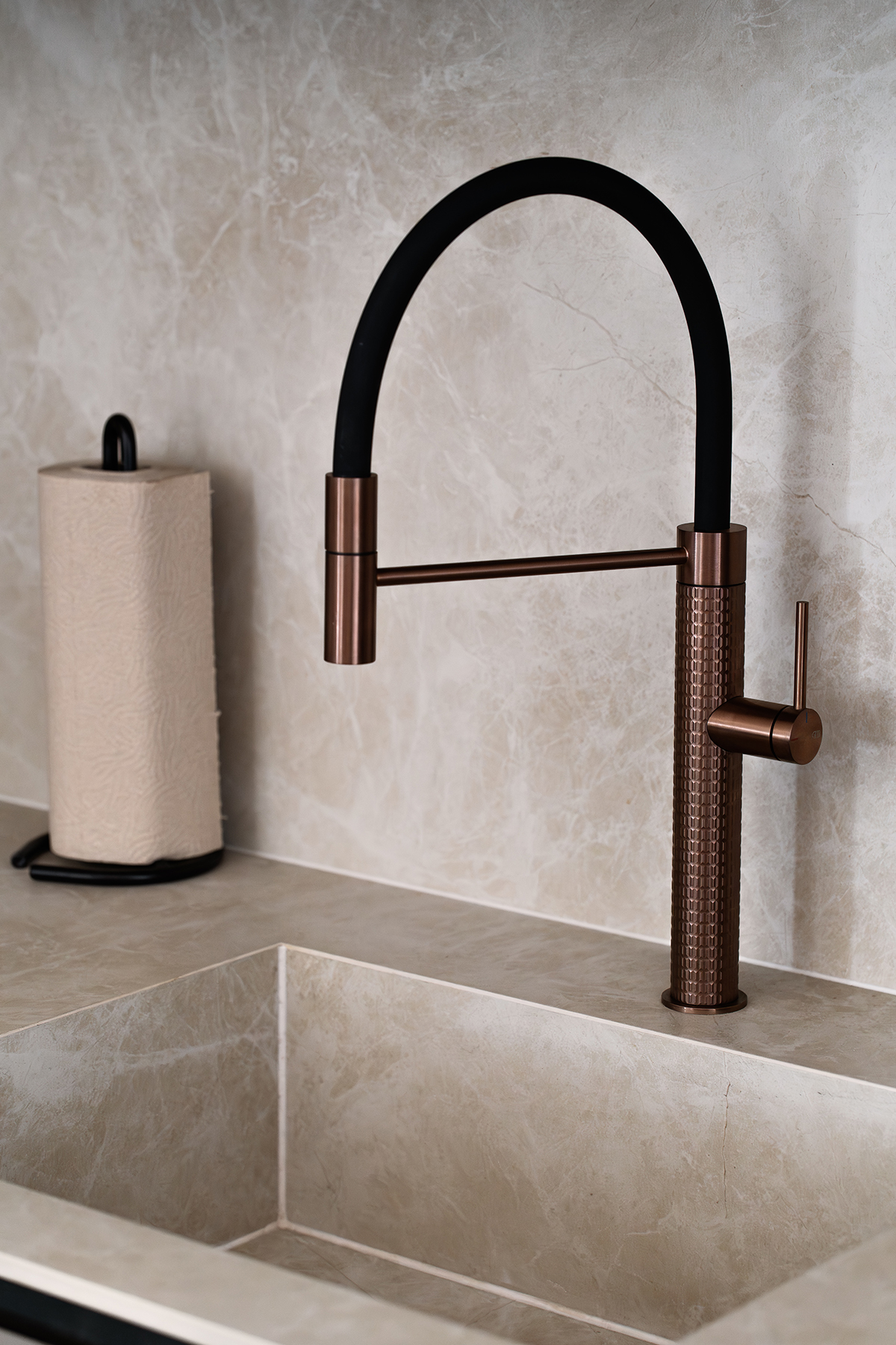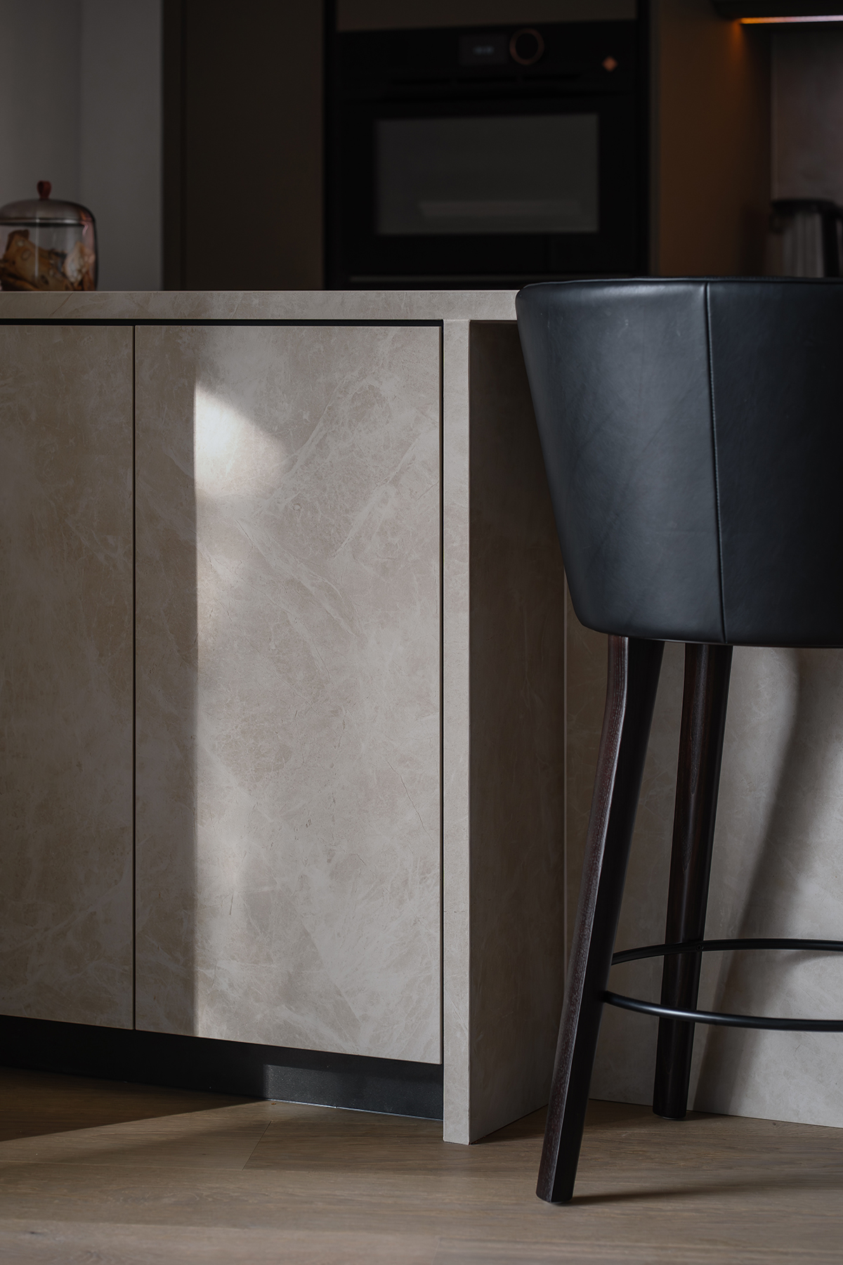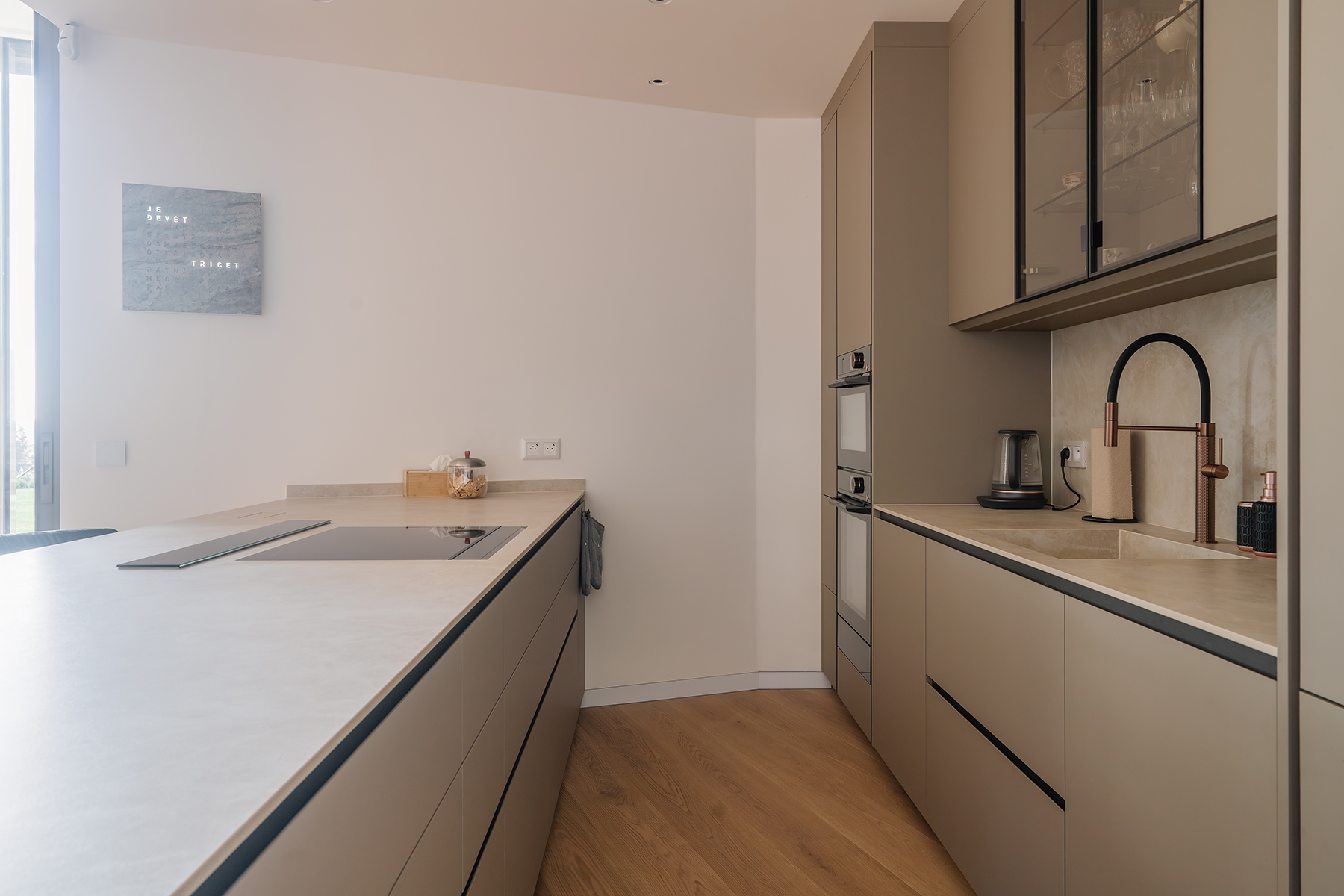 Kuchyně: baterie Gessi – 316, kuchyně Gamadecor, velkoformátový obklad Xtone – Ars Beige
