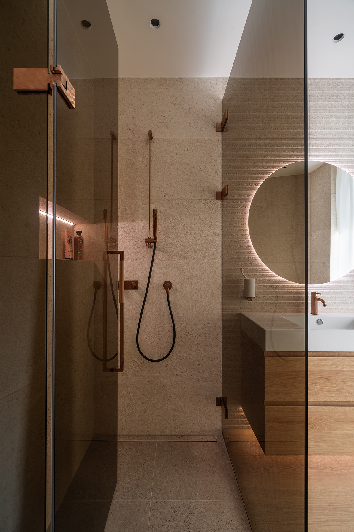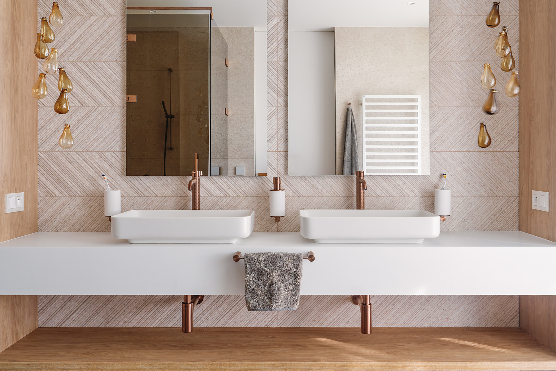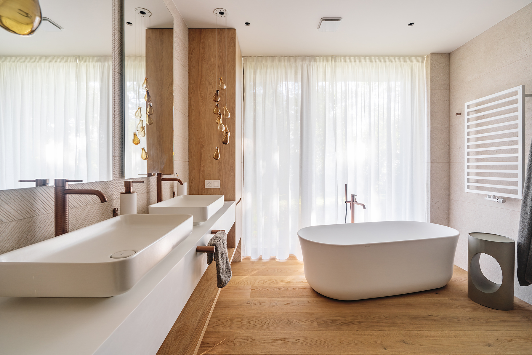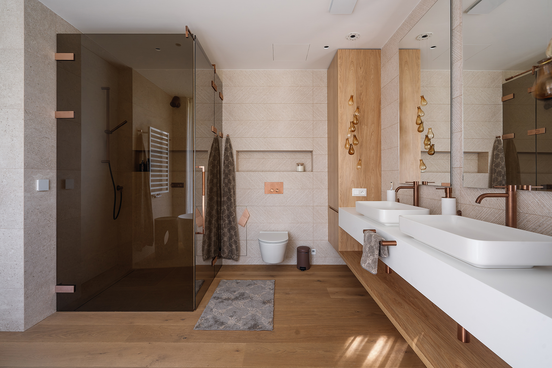 Master koupelna: baterie a doplňky Gessi – 316, splachovadlo, panty a madlo Gessi – Shower G, deska pod umyvadly z umělého kamene Krion, umyvadla Alice Ceramica, toaleta Catalano, obklady Porcelanosa – Spiga Caliza a Bottega Caliza