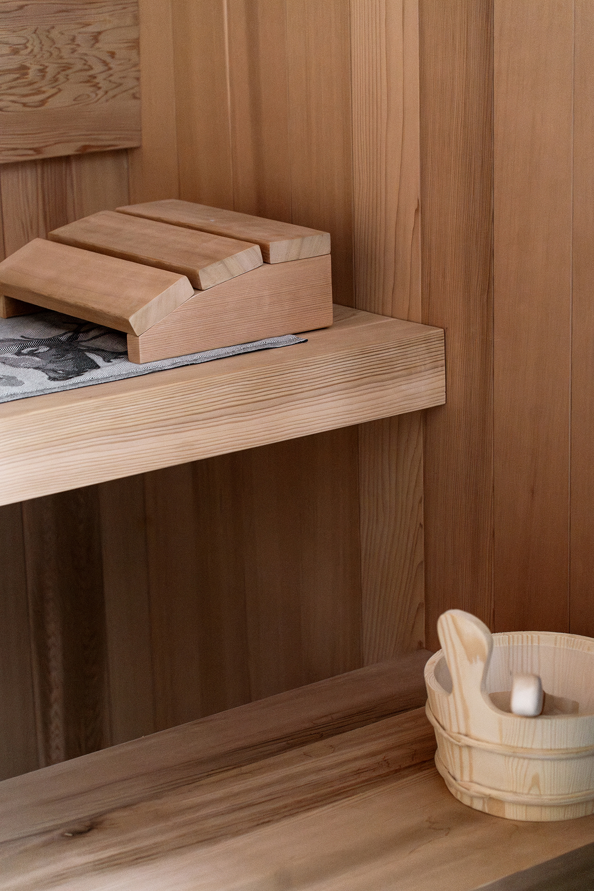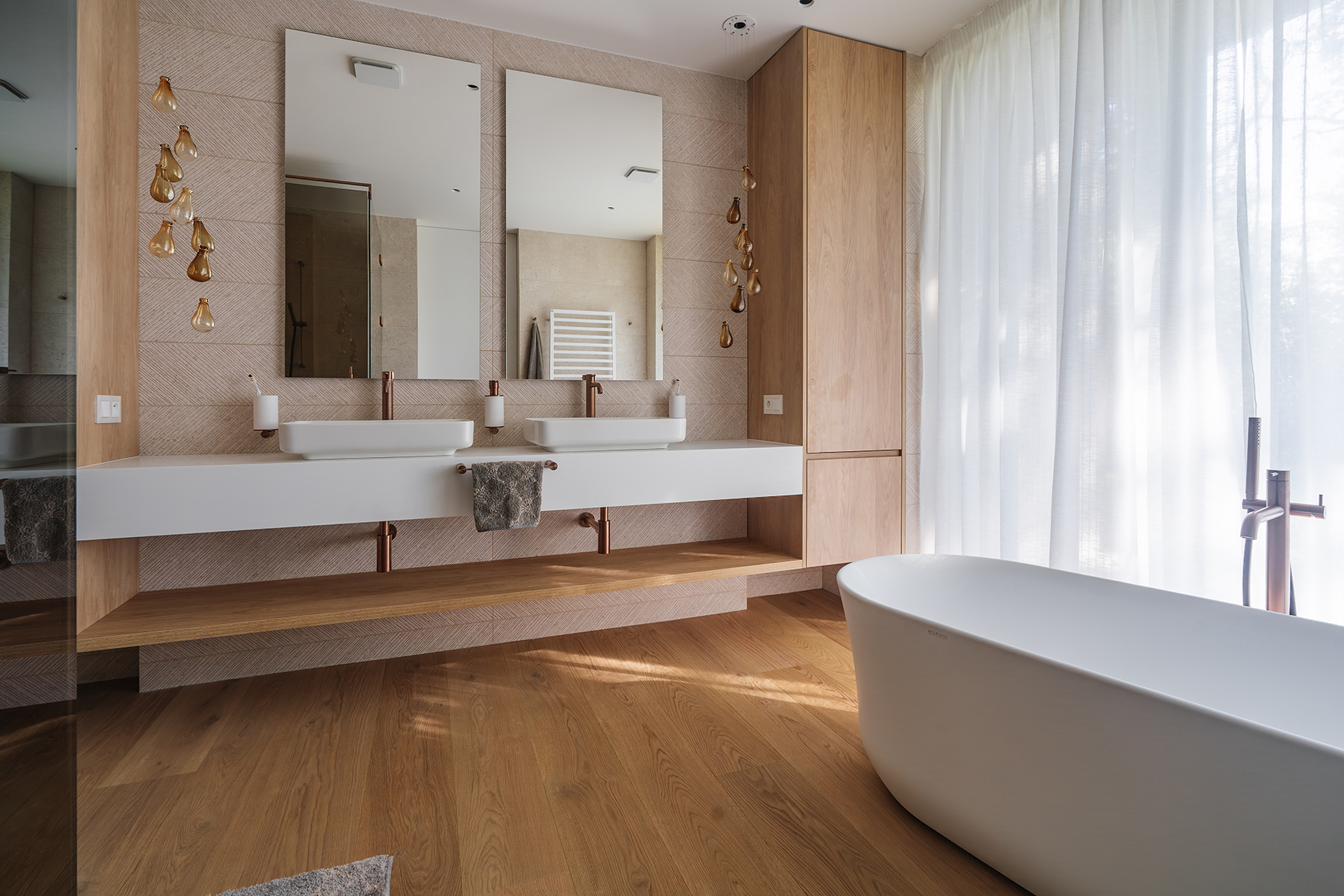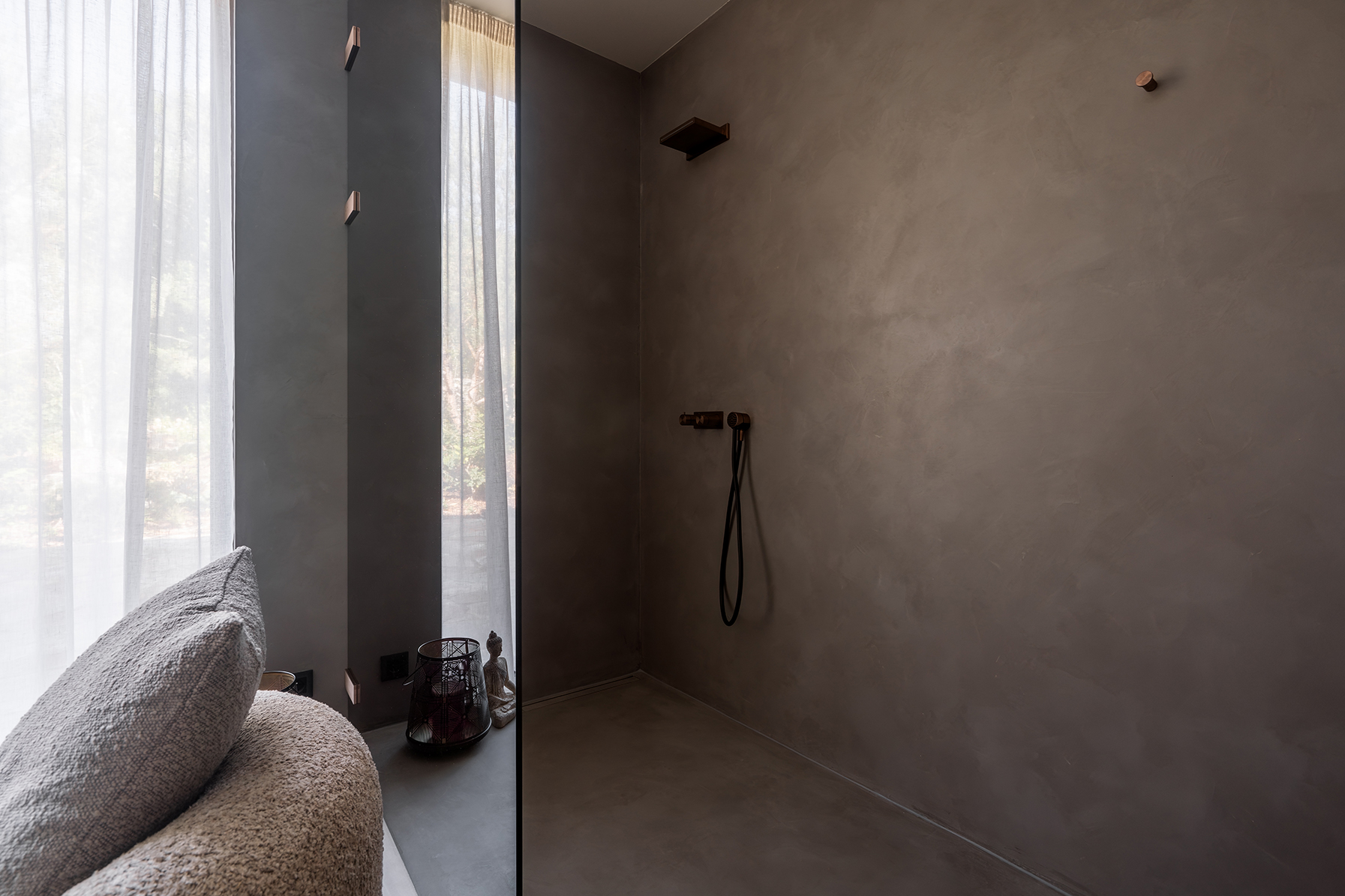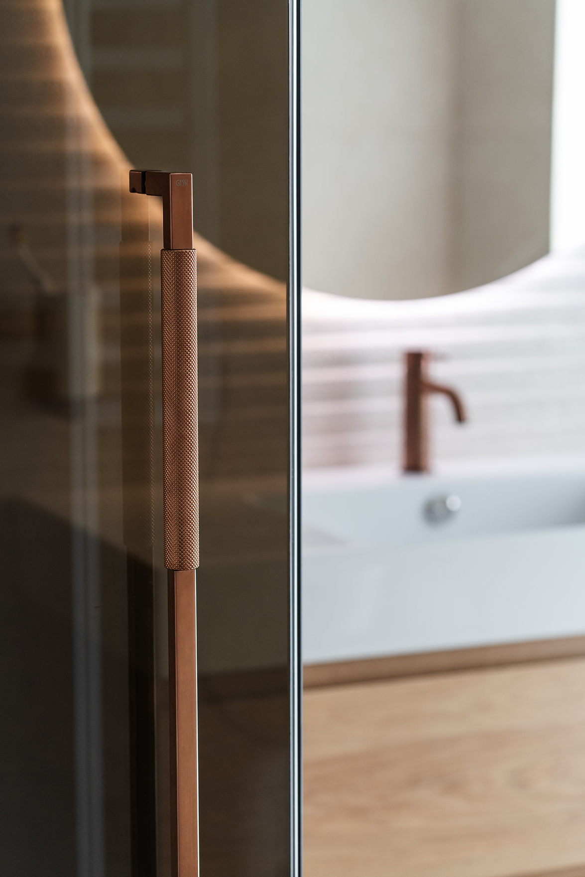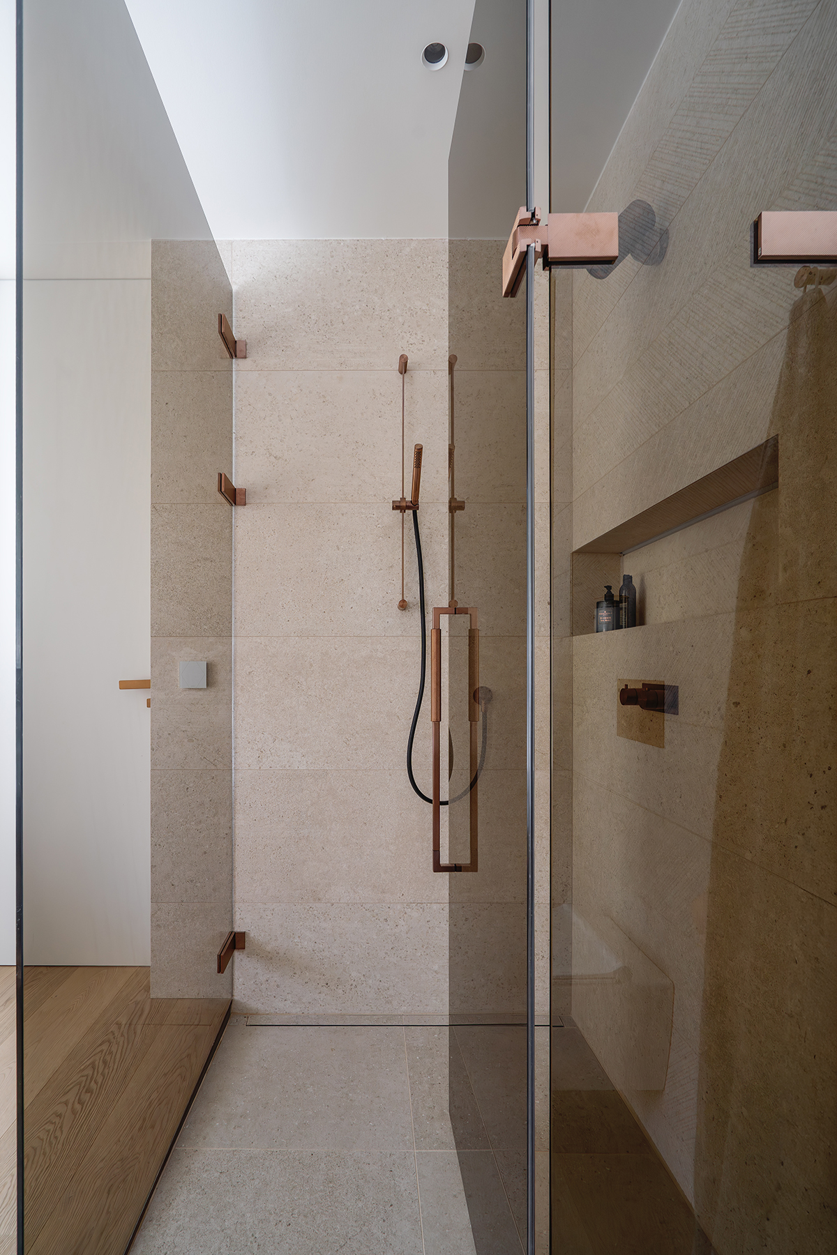 Master koupelna: baterie a doplňky Gessi – 316, splachovadlo, panty a madlo Gessi – Shower G, deska pod umyvadly z umělého kamene Krion, umyvadla Alice Ceramica, toaleta Catalano, obklady Porcelanosa – Spiga Caliza a Bottega Caliza