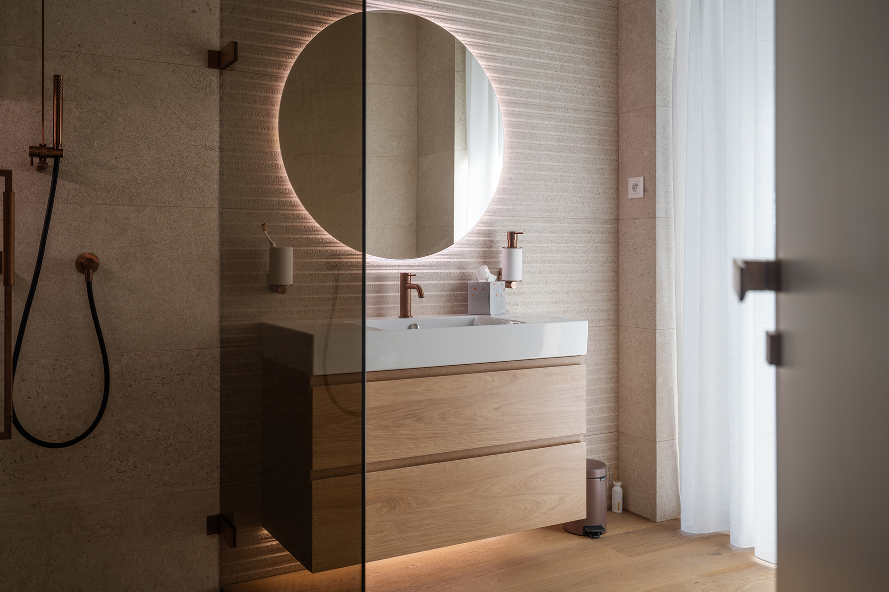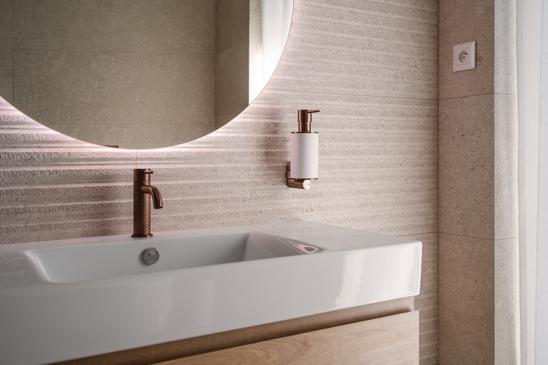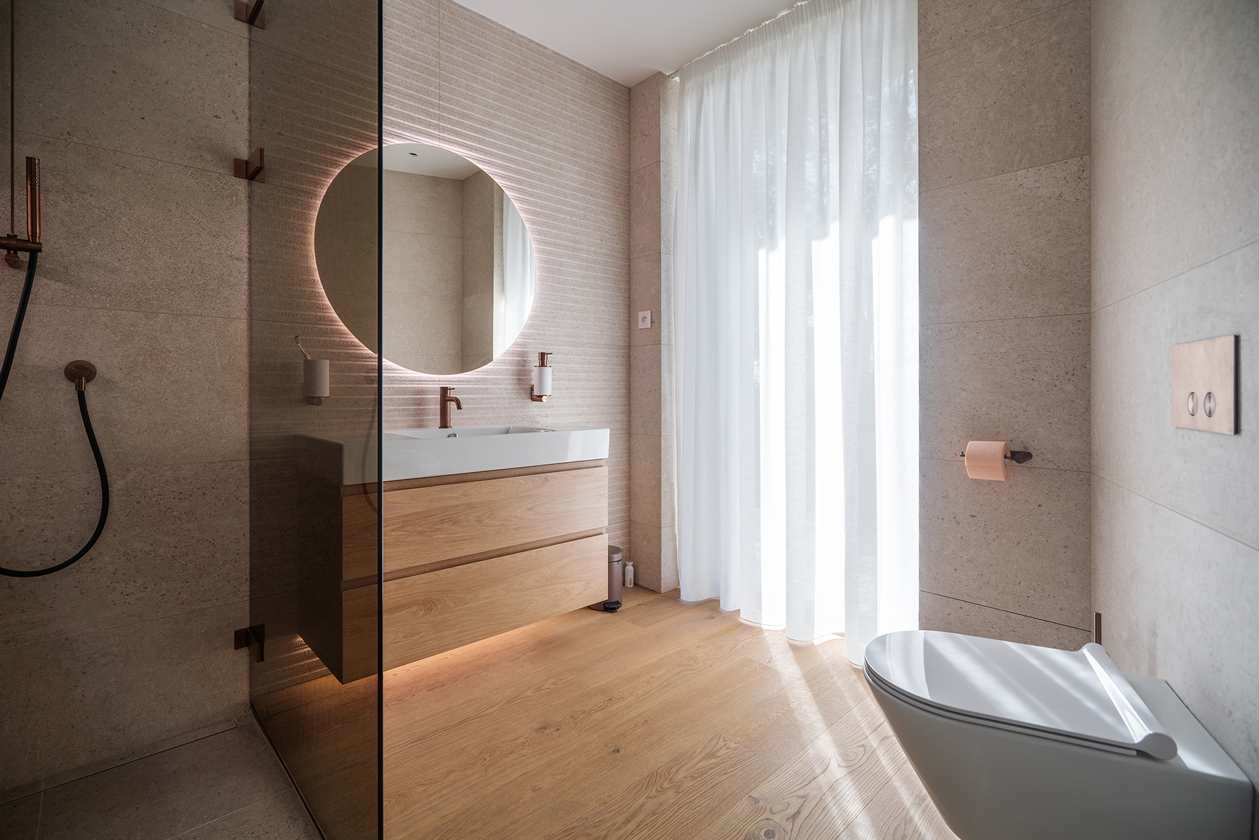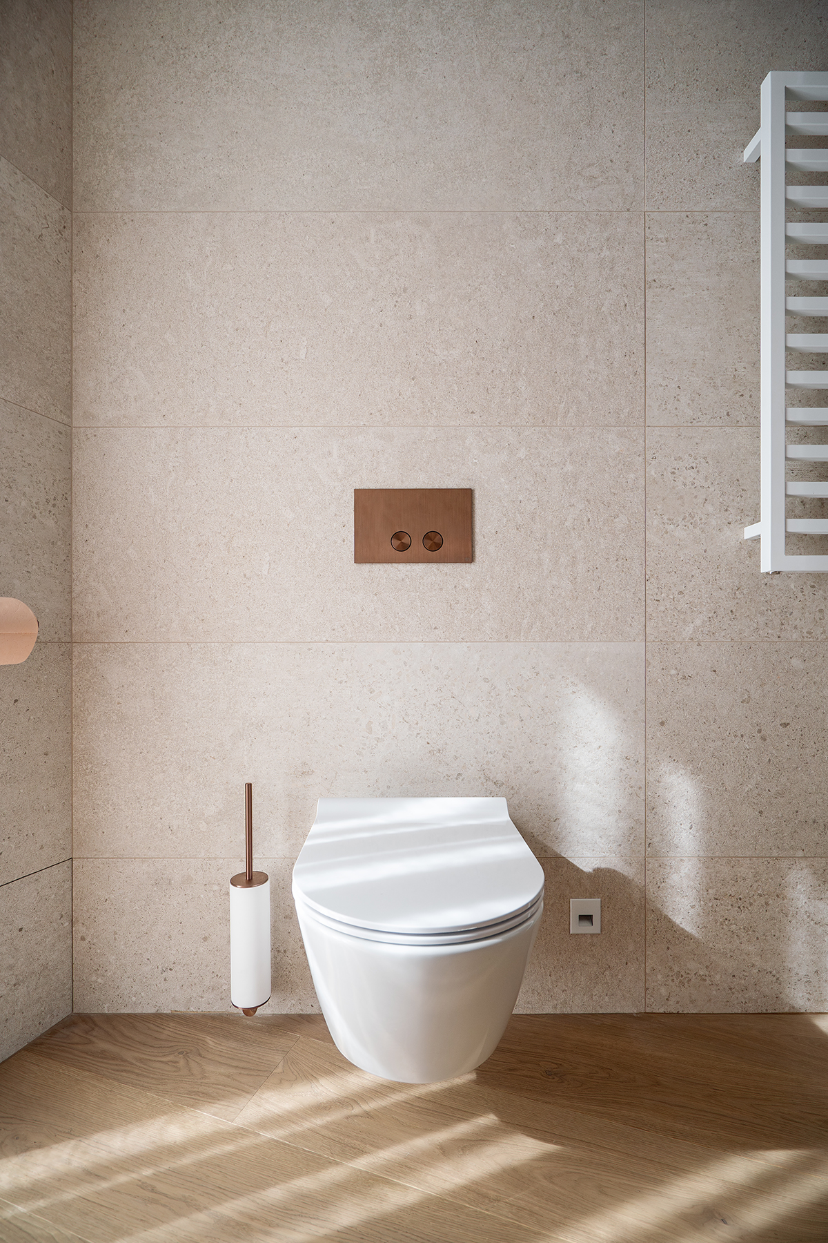 Koupelna: baterie a doplňky Gessi – 316, splachovadlo, panty a madlo Gessi – Shower G, umyvadlo a toaleta Catalano, obklady Porcelanosa – Mombasa Prada Caliza a Bottega Caliza