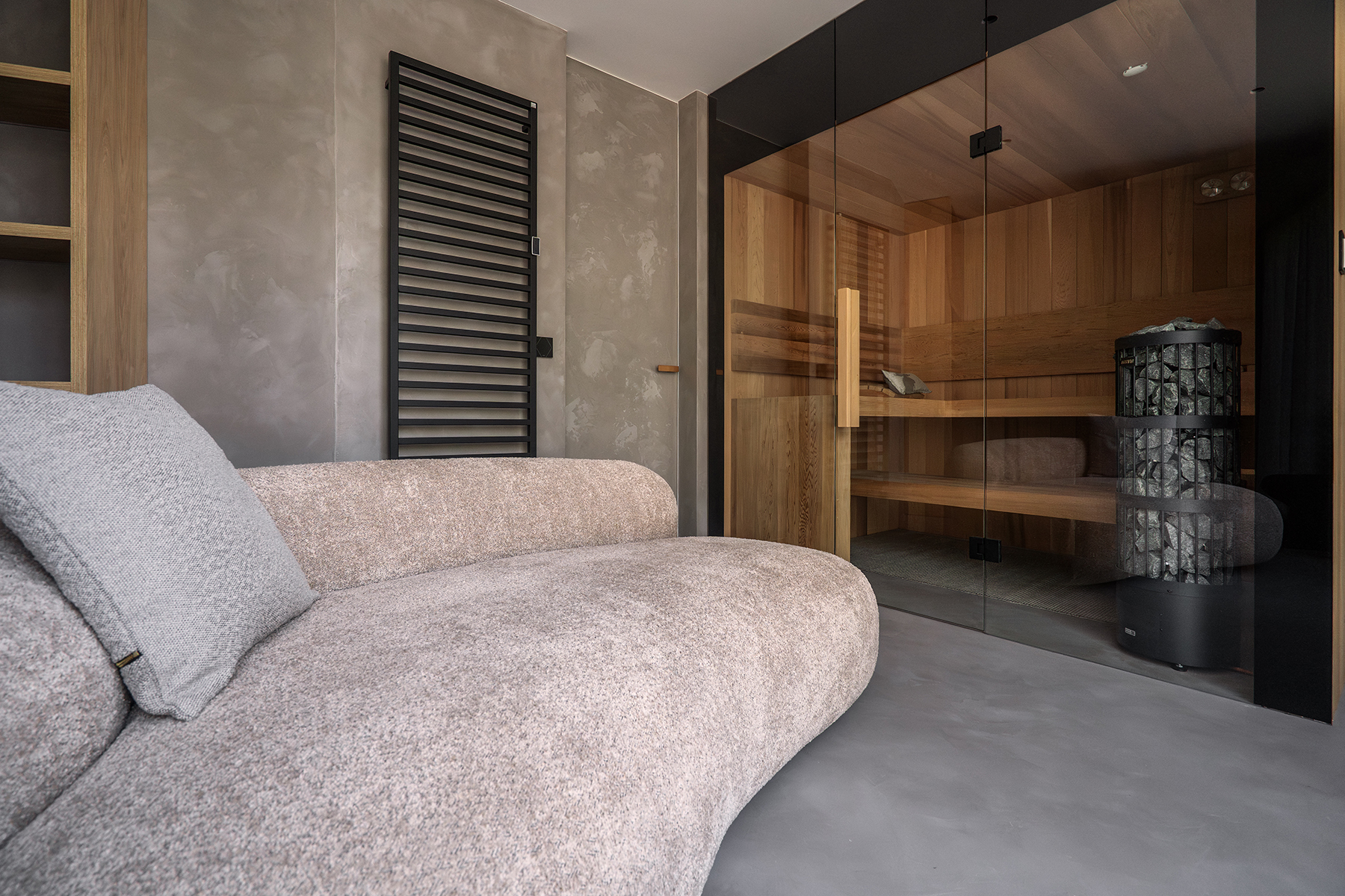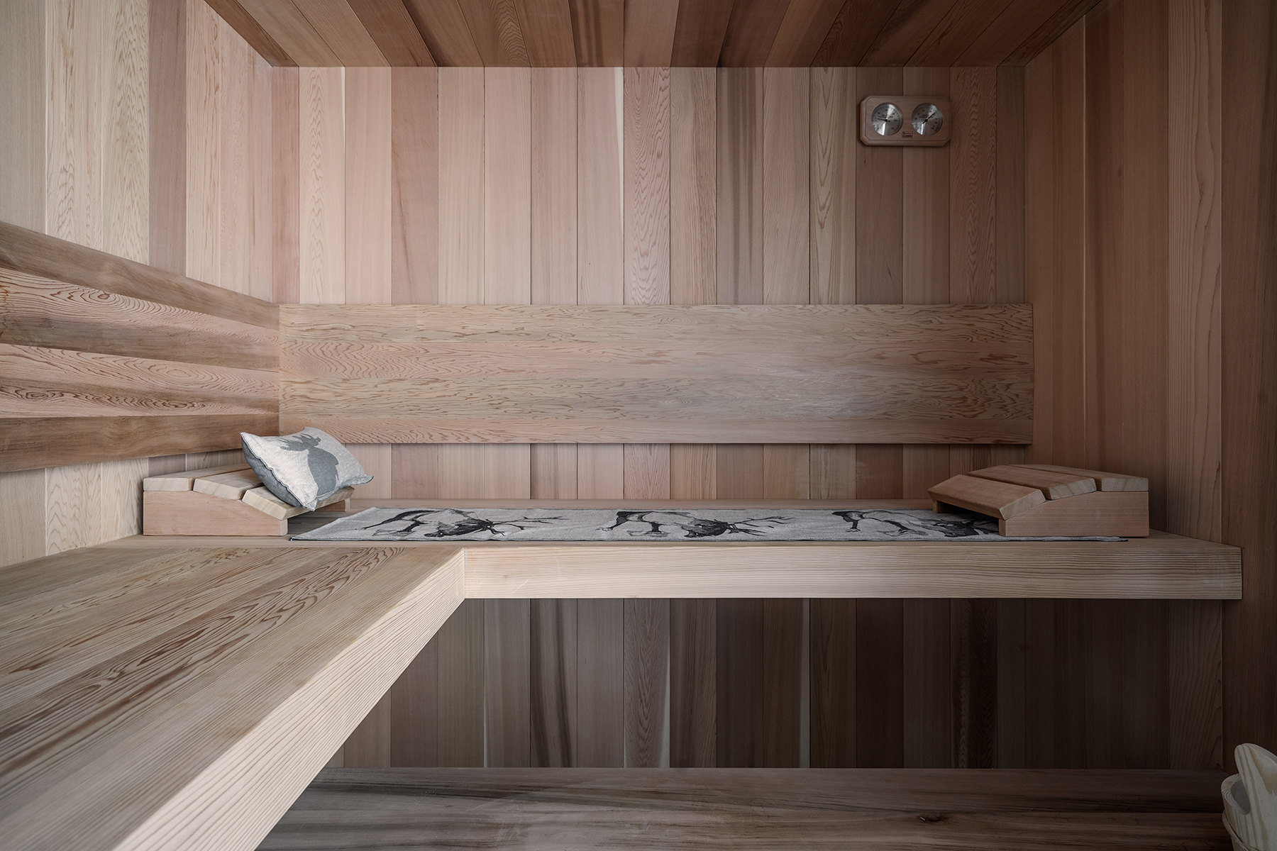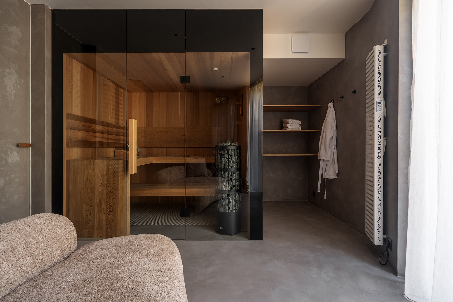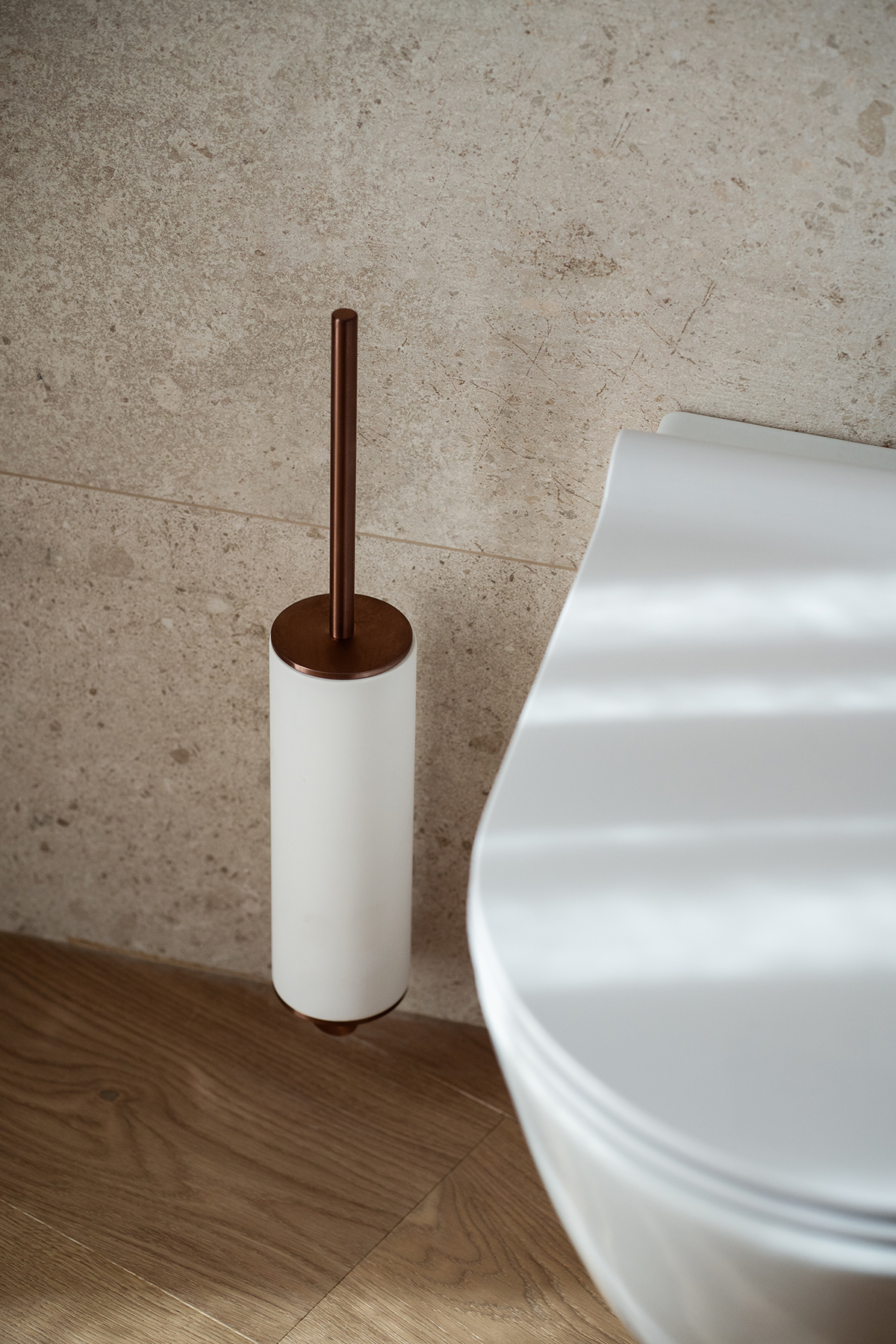Koupelna: baterie a doplňky Gessi – 316, splachovadlo, panty a madlo Gessi – Shower G, umyvadlo a toaleta Catalano, obklady Porcelanosa – Mombasa Prada Caliza a Bottega Caliza