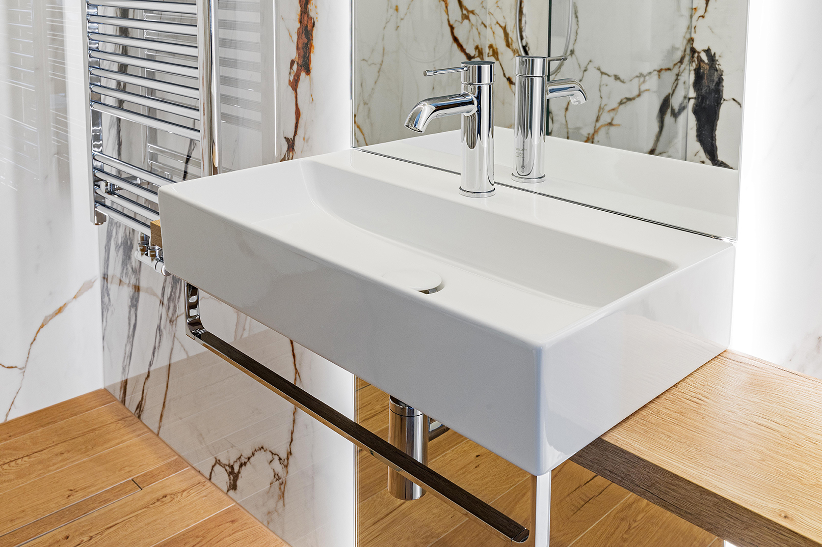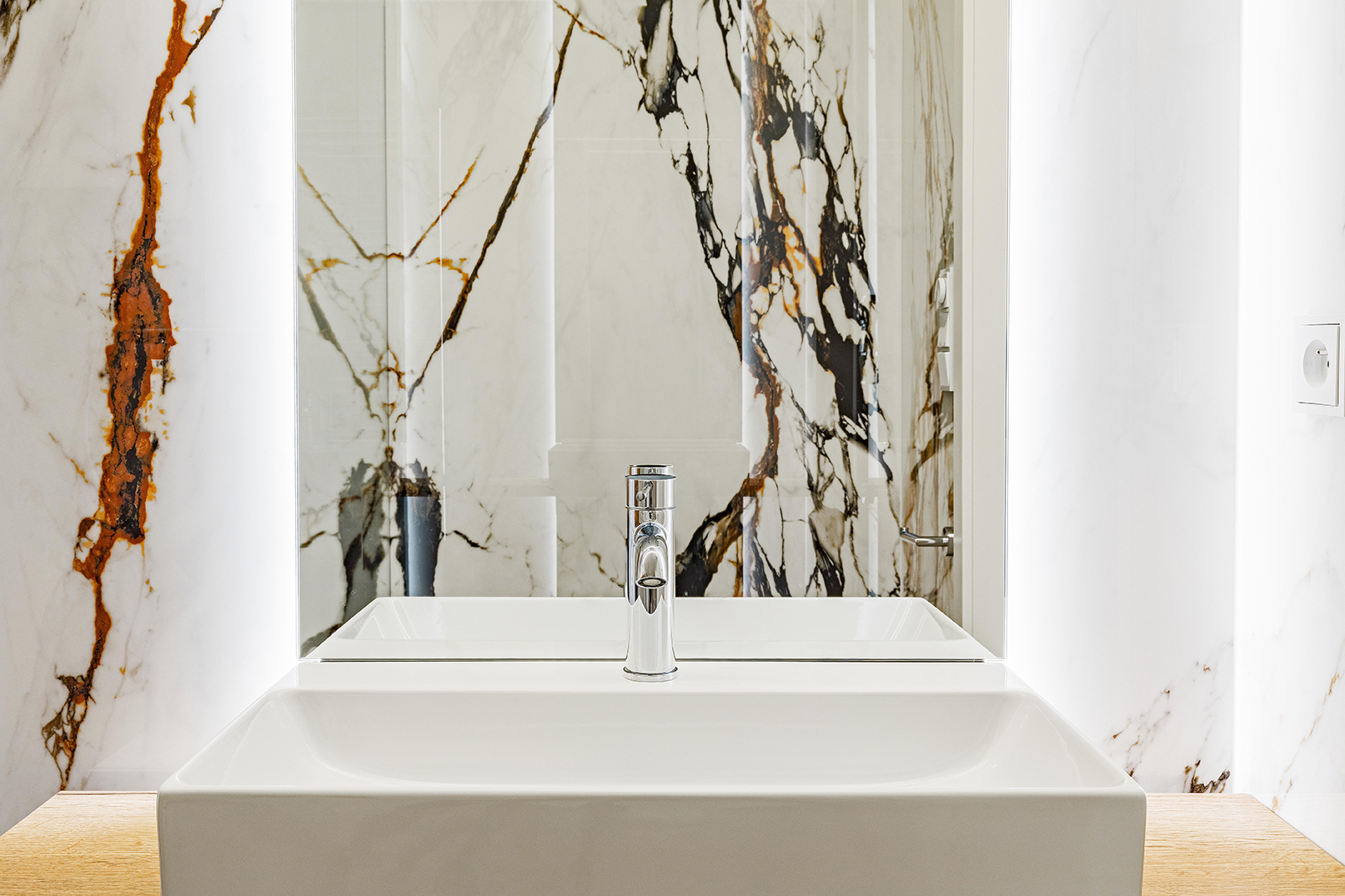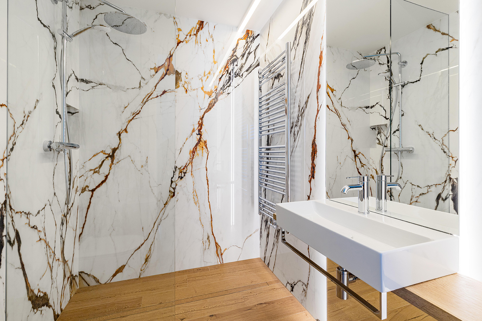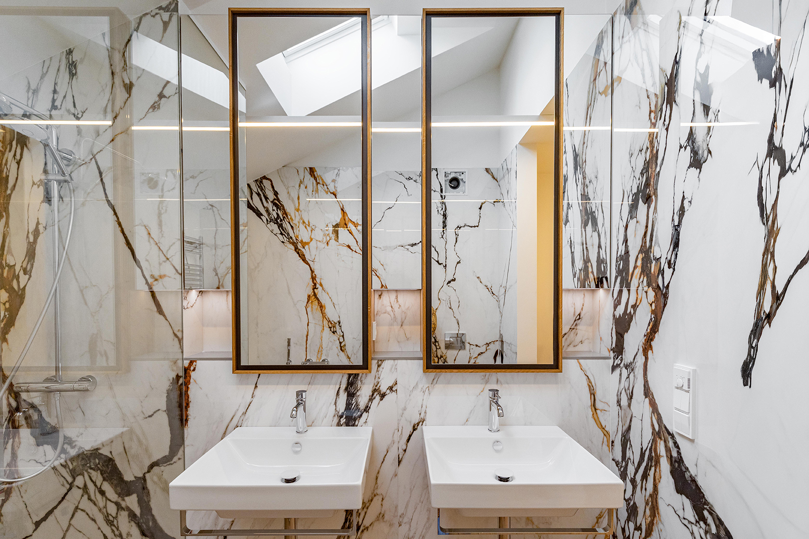 Malá koupelna: obklad Porcelanosa – Paonazzo Biondo Polished, dlažba Delaware Natural, umyvadlová a sprchová baterie Grohe – Essence, keramické umyvadlo Catalano – Premium, toaleta Catalano – Zero, topení Zehnder – Aura, atypická deska pod umyvadlo na míru se zrcadlovým obkladem