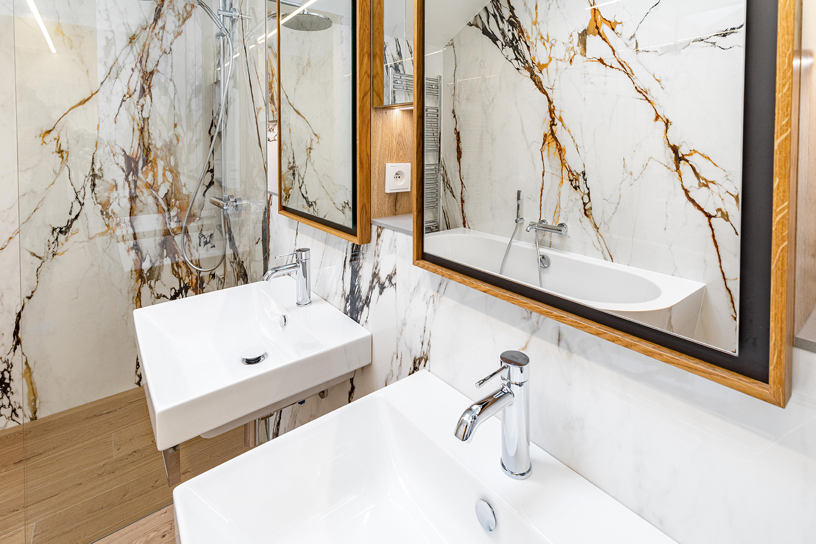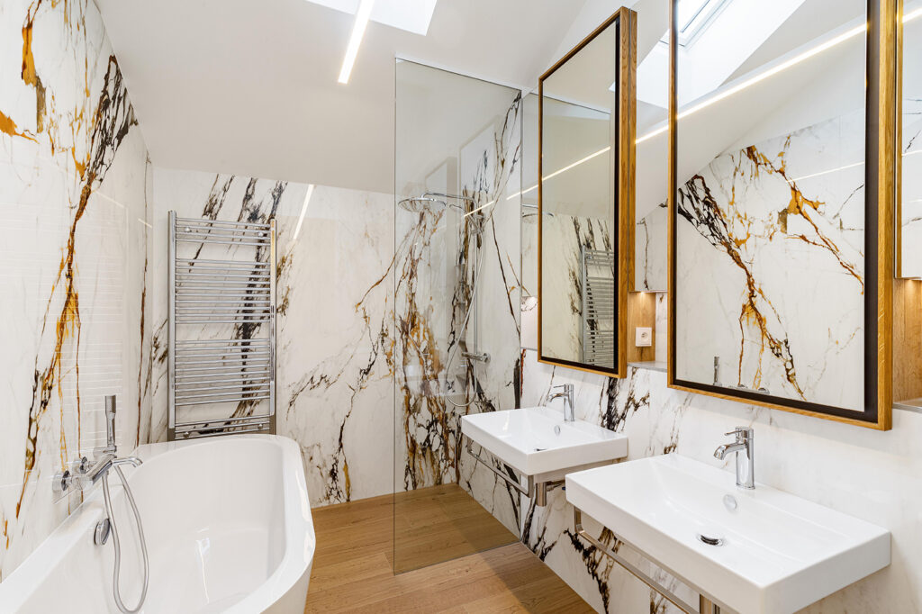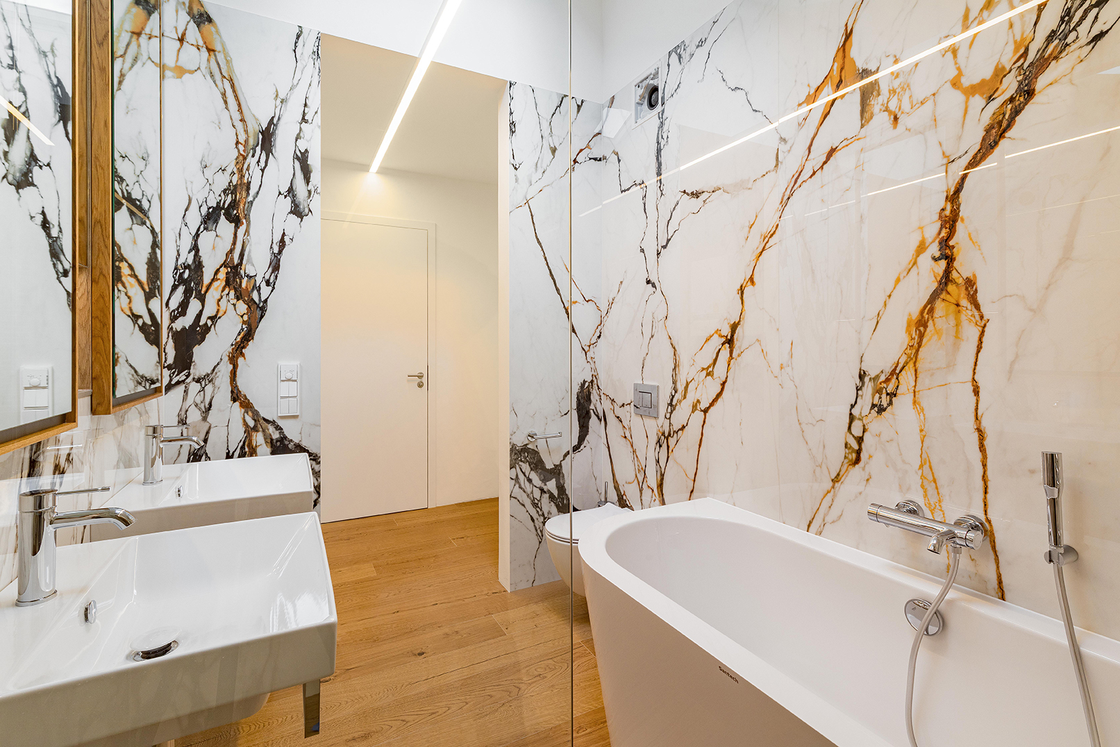 Koupelna s vanou: obklad Porcelanosa – Paonazzo Biondo Polished, dlažba Delaware Natural, vanová, umyvadlová i sprchová baterie Grohe – Essence, keramická umyvadla Catalano – Zero, toaleta Catalano – Zero, vana Santech – Time Top D, topení Zehnder – Aura, atypický truhlářský nábytek s masivními dubovými rámečky, doplněný nikami z umělého kamene – Krion